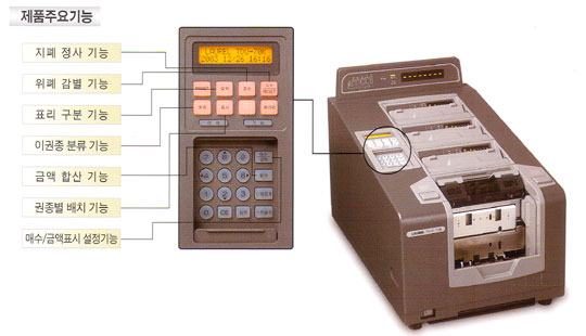 지폐 종류 선별, 앞뒤 선별, 상하처리 기능 등 찢어진 지폐, 테이프 붙인 돈,